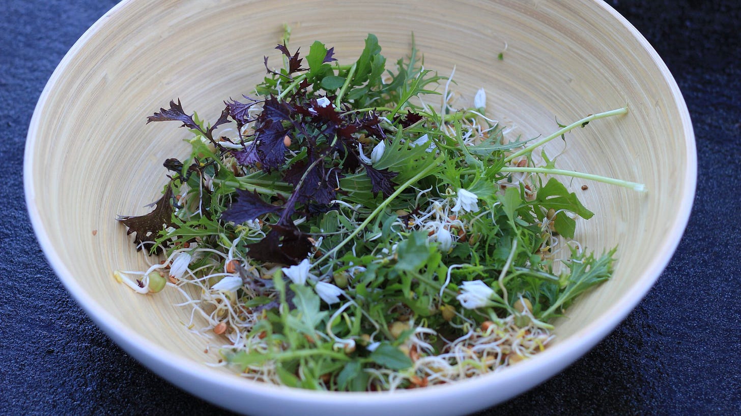 Early spring salad: mustard and rocket / arugula leaves, three cornered leek flowers and bean sprouts (home sprouted).
